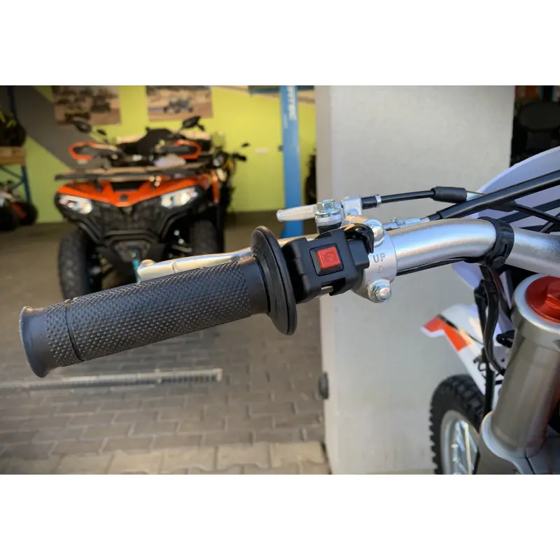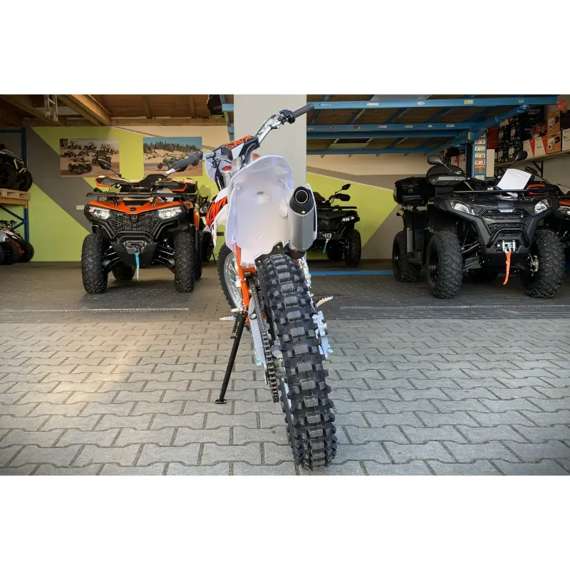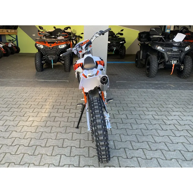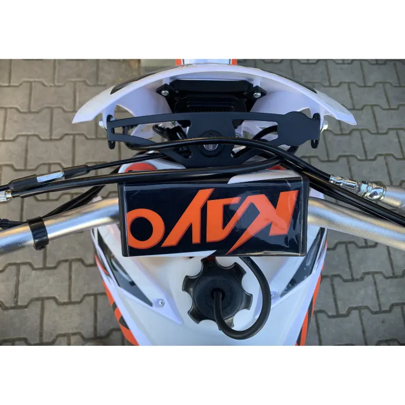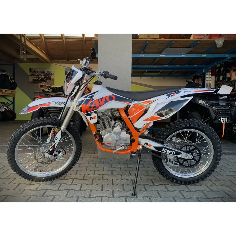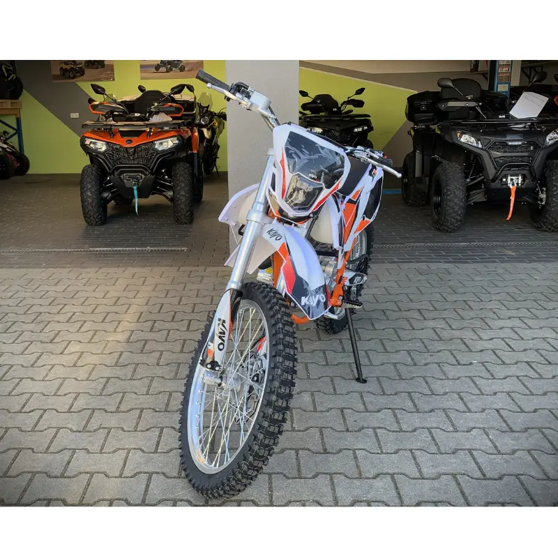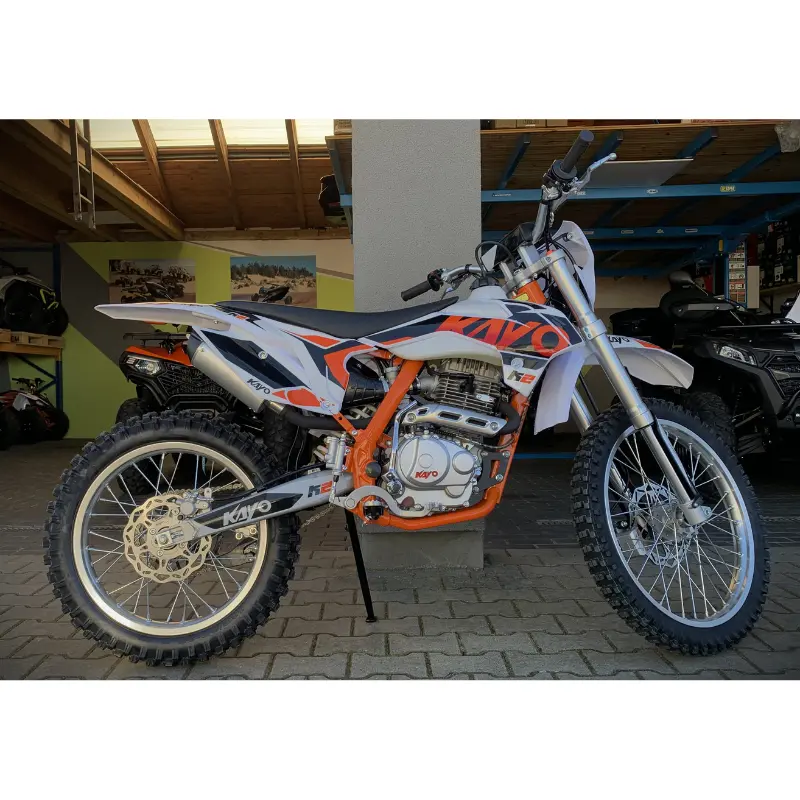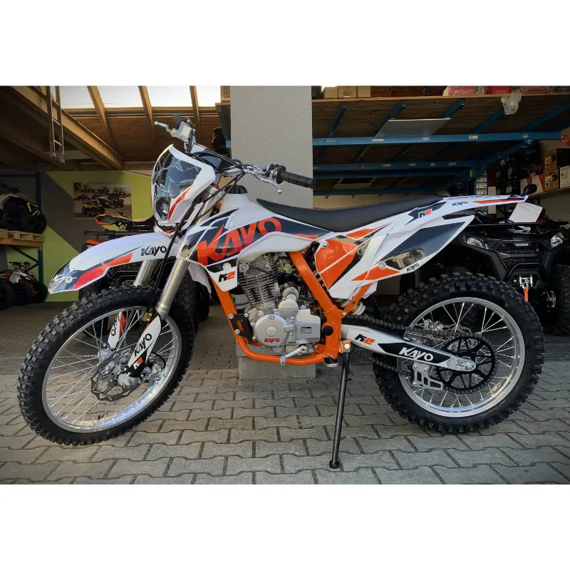 KAYO K2 250 Enduro to lekki i wytrzymały motocykl terenowy, idealny dla młodzieży od 14 lat i dorosłych. Silnik o pojemności 249 cm³ i masie zaledwie 105 kg zapewnia doskonałe osiągi, a pięciostopniowa skrzynia biegów pozwala na optymalne dostosowanie przełożeń. Duży zbiornik paliwa 6,7 l i ekonomiczny silnik gwarantują długą jazdę bez częstego tankowania. Aluminiowe koła 21” i 18” z wysokiej jakości oponami doskonale sprawdzają się w każdym terenie, a przednia lampa umożliwia jazdę po zmroku. Hydrauliczne hamulce tarczowe zapewniają skuteczne i bezpieczne zatrzymywanie motocykla w każdych warunkach.