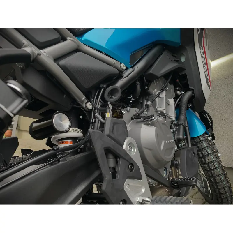 CFMOTO 450MT to motocykl stworzony dla prawdziwych entuzjastów przygód. Wyposażony w nowoczesny, 2-cylindrowy silnik o pojemności 449 cm³, oferuje dynamiczną moc 31 kW przy 8500 obr./min oraz imponujący moment obrotowy wynoszący 42 Nm przy 6500 obr./min. Chłodzony cieczą, czterozaworowy silnik DOHC z wałem korbowym o kącie 270° zapewnia płynną i responsywną jazdę. Wtrysk paliwa BOSCH EFI oraz stopień sprężania 11,5:1 dodatkowo zwiększają efektywność paliwową oraz osiągi.