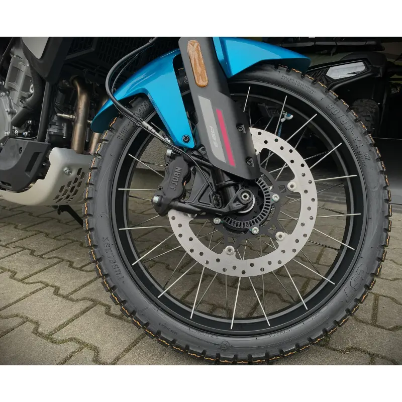 Motocykl wyposażony jest w zaawansowany system hamulcowy z pojedynczymi tarczami: przednią o średnicy Φ320 mm i tylną Φ240 mm, oba z zaciskami J.Juan. Szprychowe, bezdętkowe obręcze oraz opony 90/90 R21 CST (przód) i 140/70 R18 CST (tył) zapewniają doskonałą przyczepność na różnych nawierzchniach.