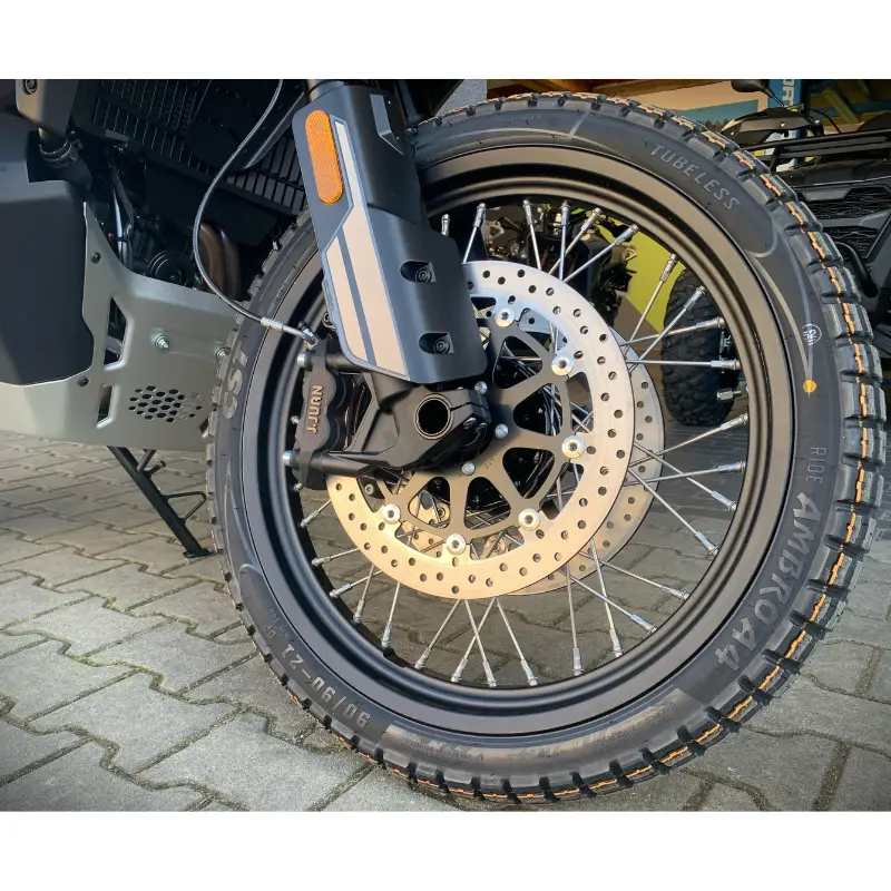 800MT-X jest naszpikowany najlepszymi technologiami wspomagającymi jazdę, zapewniającymi doskonałą kontrolę i bezpieczeństwo. Wyposażono go w sprzęgło antyhoppingowe, ABS, trzy tryby jazdy, tempomat, quickshifter oraz kontrolę trakcji (TCS) z 6-osiowym czujnikiem IMU od Boscha. Dodatkowo znajdziemy tu również amortyzator skrętu oraz monitor ciśnienia w oponach. Dzięki tym rozwiązaniom możesz pewnie poruszać się zarówno po trudnym terenie, jak i po gładkich autostradach, mając pełne wsparcie nowoczesnych systemów bezpieczeństwa.